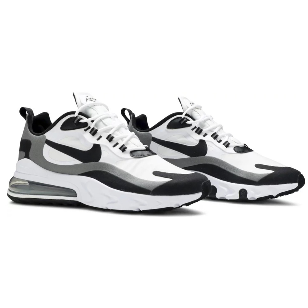 This model combines the sleek contrast of black and white with metallic pewter accents. Featuring Nike Air Max 270 React technology, it provides superior cushioning and support. A comfortable and durable sneaker that completes your everyday style.